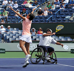 Indian Wells, March 17, 2011 Francesca SCHIAVONE (ITA) and Bethanie MATTEK-SANDS playing doubles with wheelchair tennis athletes. Photo Ray Giubilo